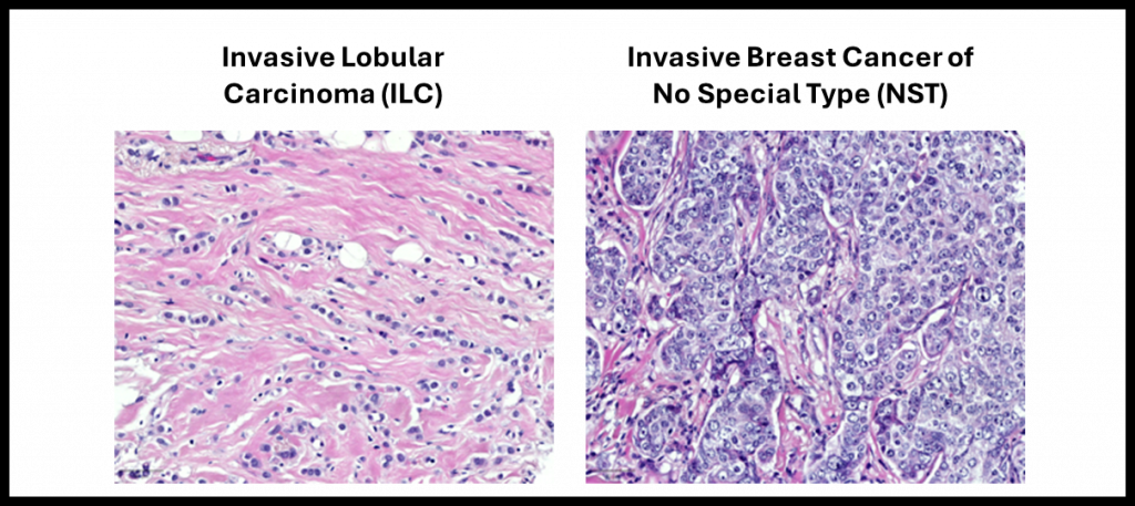 The histologic growth pattern of invasive lobular breast cancer (ILC) shows a hallmark single file pattern compared to the more cohesive growth pattern seen in invasive ductal breast cancer, or breast cancer of no special type (NST). This is due to the loss of the membranous cell adhesion protein E-cadherin in ~90% of all ILCs, and leads to more difficult diagnosis on imaging.